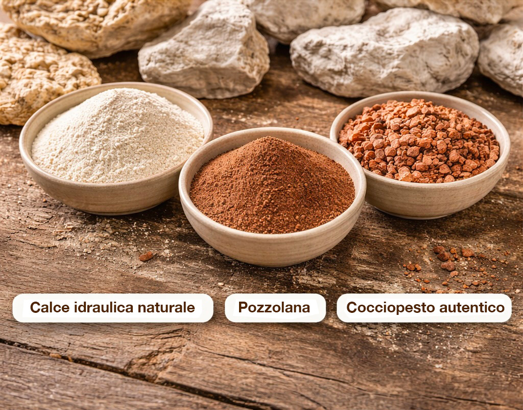 La calce idraulica naturale NHL 3.5 (EN 459-1) non è un legante “debole”. È un legante minerale che sviluppa resistenza attraverso: Reazione idraulica con l’acqua, Carbonatazione della calce aerea con CO₂ atmosferica, Reazione pozzolanica tra calce e silico-alluminati (pozzolana, cocciopesto, zeolite), Formazione di silicati e alluminati di calcio stabili.