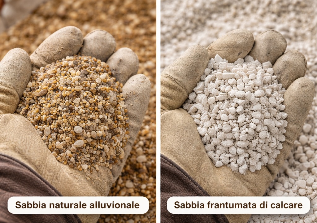 La differenza sostanziale rispetto ai prodotti industriali standard sta negli inerti naturali non macinati, non assorbenti e chimicamente stabili. A differenza delle sabbie frantumate di carbonato di calcio, non sottraggono acqua al legante, non favoriscono cavillature e resistono meglio agli attacchi di sali e piogge acide.