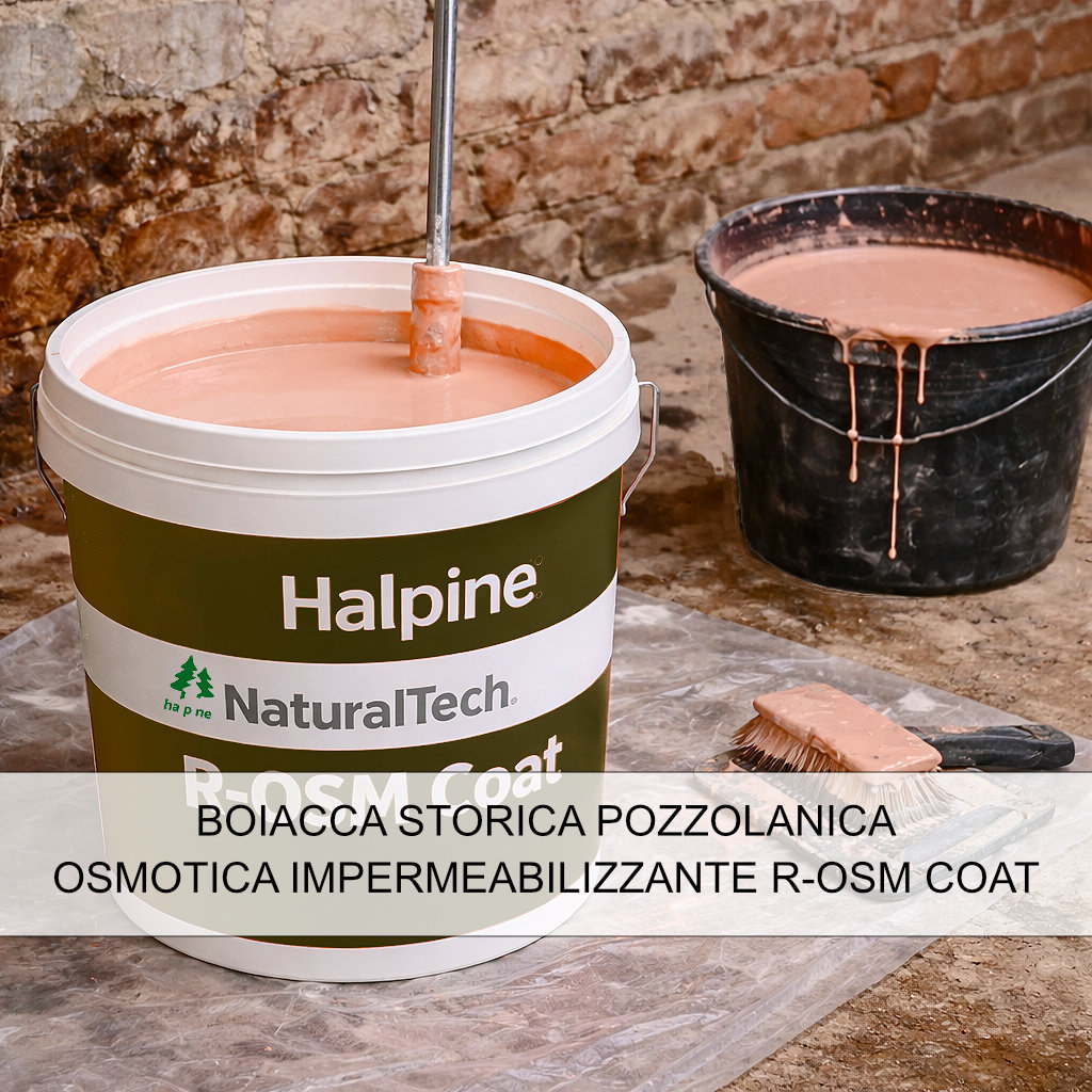 La Boiacca Storica Pozzolanica Osmotica Halpine NaturalTech R-OSM Coat rappresenta la seconda fase del ciclo di risanamento ed è una boiacca minerale composta da calce idraulica naturale NHL 3.5 (EN 459-1), cemento naturale storico, pozzolana romana naturale, cocciopesto “Doc” micronizzato (EN 197-1) e sabbie naturali alluvionali certificate (EN 13139), conforme alla EN 998-1 e classificata GP/CS IV/W2.
