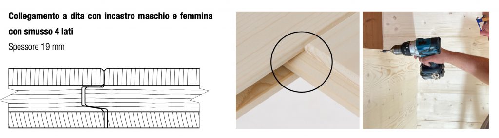La struttura a 3 strati incrociati conferisce ai pannelli una stabilità dimensionale elevata, rendendoli affidabili nel tempo. Le lamelle sono collegate tramite finger joint con incastro maschio-femmina su tutto il perimetro, con smusso perimetrale che migliora l’estetica e facilita la posa.