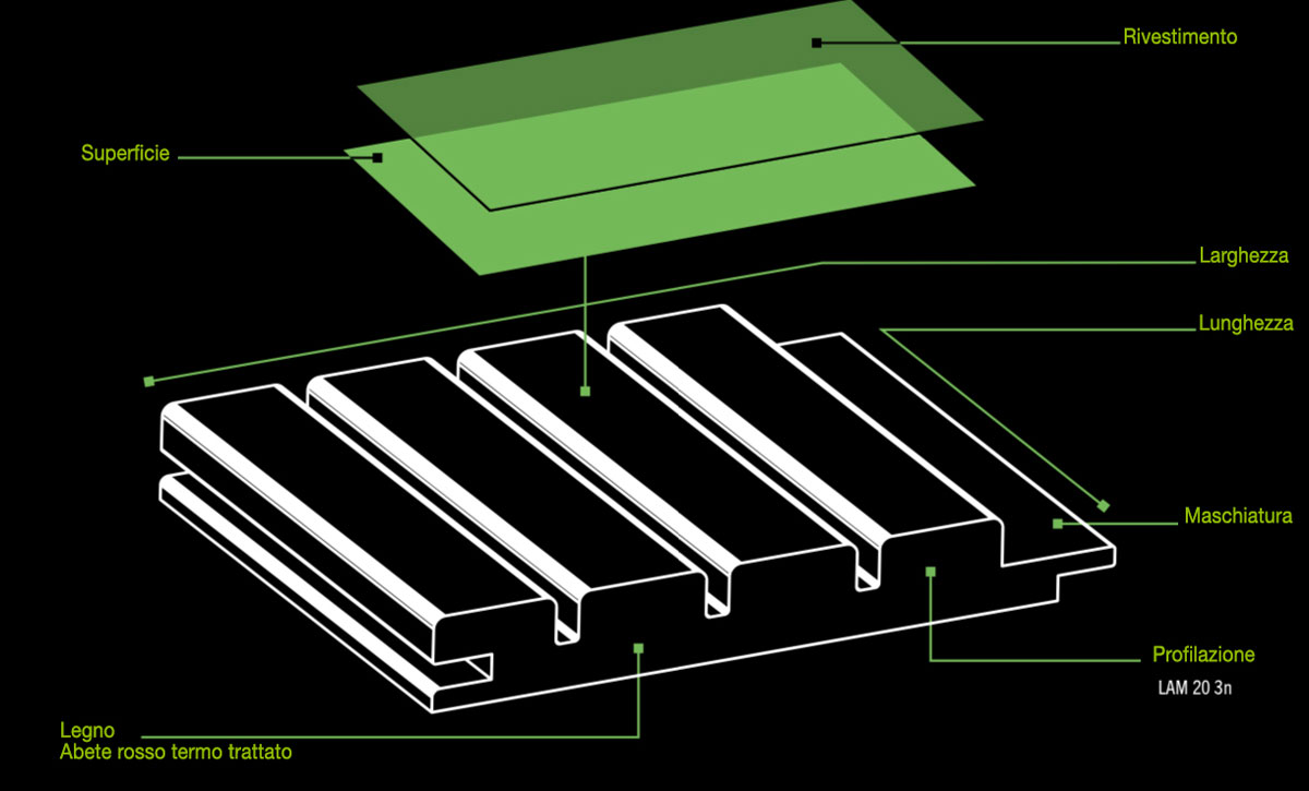 Rispetto ai prodotti tradizionali, le tavole LAM termotrattate offrono un vantaggio concreto anche sul piano funzionale. Il profilo tridimensionale è studiato per spezzare l’onda sonora, contribuendo in modo efficace alla riduzione del riverbero e alla limitazione della propagazione dei rumori.